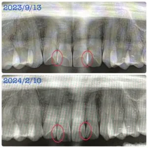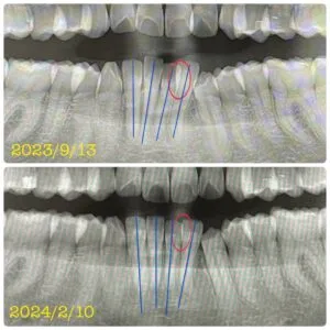 ・写真3枚目の青いたて線は、歯の傾き(歯軸)が改善された箇所